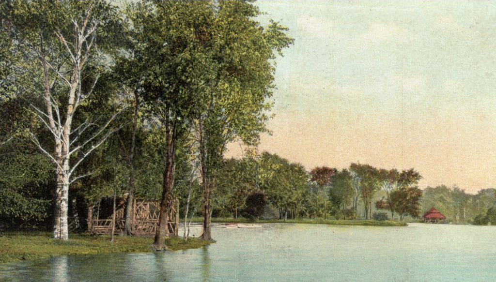 The rustic shelters shown in the photograph provided destination points for the flotilla of rowboats on Prospect Lake, designed by Frederick Law Olmsted and Calvert Vaux in 1866. A stream flowed constantly into the lake along a watercourse designed by Olmsted and Vaux. A massive steam-pump recirculated water from the lake to the Fallkill Falls near the Long Meadow, after which it flowed through pools along the meadow, over a series of falls in the steep-sided Ravine, past the pastoral Nethermead and back into the lake. - C.E. Beveridge {Vegetation - Circuation - Water Feature - Structure}