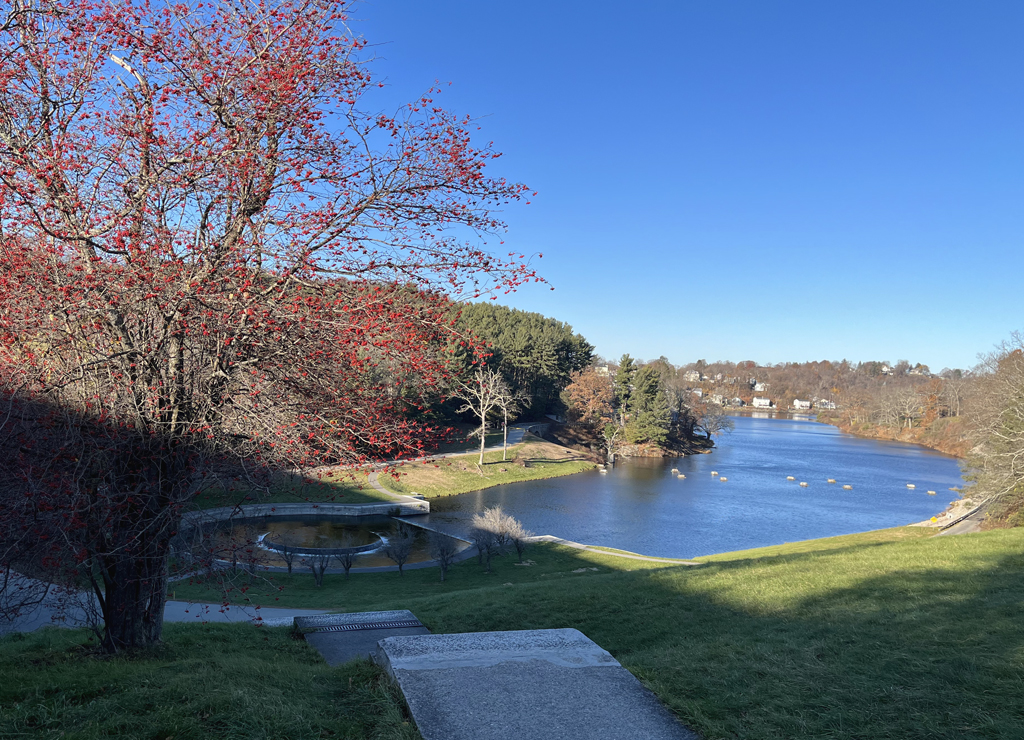 Looking down to formal basin below Wachusett Dam on the Nashua River. {Topography - Vegetation - Circulation - Water Feature - Structure}
