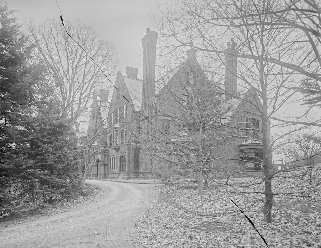 Black and white glass negative of B. Schlesinger mansion and driveway. Courtesy of Smithsonian Institution, Archives of American Gardens, Thomas Warren Sears Photograph collection. {Vegetation - Circulation - Building} [MA122010]