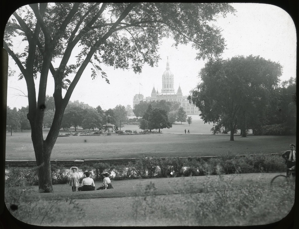 Black and white glass negative showing users in the park and a distant view of Connecticut State Capitol. Courtesy of Smithsonian Institution, Archives of American Gardens, J. Horace McFarland Company collection. {Vista - Topography - Water Feature - Building} [CT063001]
