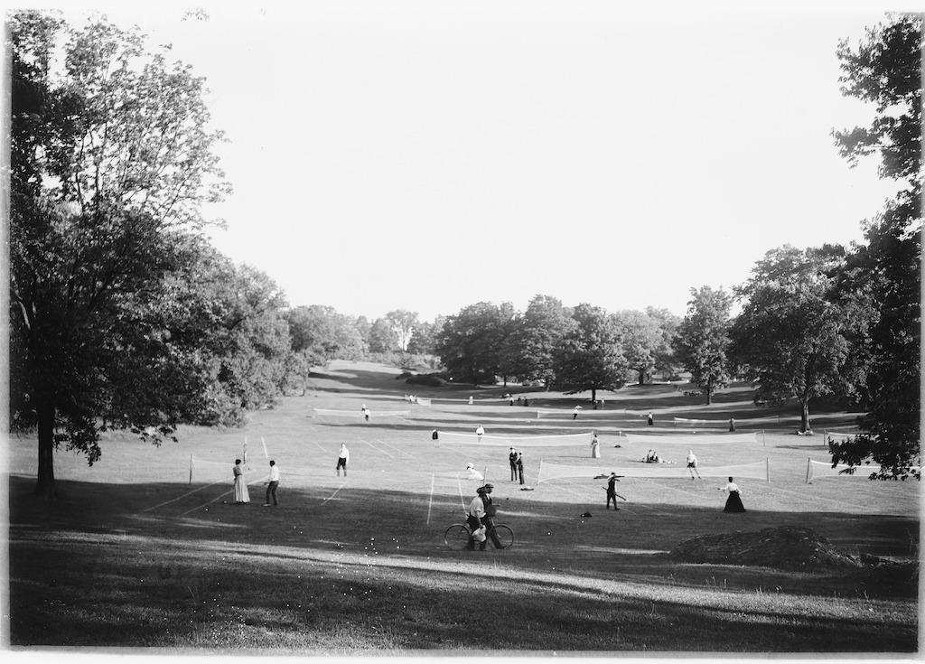 Black and white lantern slide of men and women at the tennis courts in Ellicott Dale. Courtesy of Smithsonian Institution, Archives of American Gardens, Thomas Warren Sears Photograph collection. {Vegetation} [MA047018]