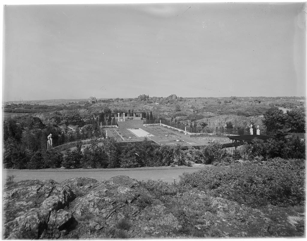 Black and white photonegative showing a distant view of Beacon Hill garden and rolling landscape. Courtesy of Smithsonian Institution, Archives of American Gardens, Thomas Warren Sears Photograph collection. {Vista - Topography - Vegetation} [RI035041_001]