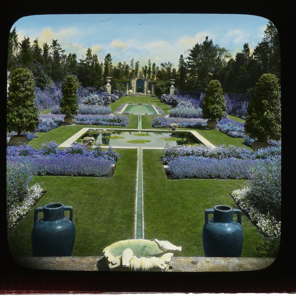 Hand-colored lantern slide of the blue garden at Arthur Curtiss James estate in Newport, RI. Courtesy of Smithsonian Institution, Archives of American Gardens, The Garden Club of America collection. {Vegetation - Water Feature} [RI035005]