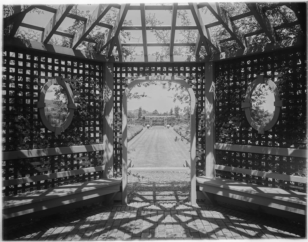 Black and white photonegative of a gazebo and walkway at Beacon Hill. Courtesy of Smithsonian Institution, Archives of American Gardens, Thomas Warren Sears Photograph collection. {Circulation - Structure} [RI035045]