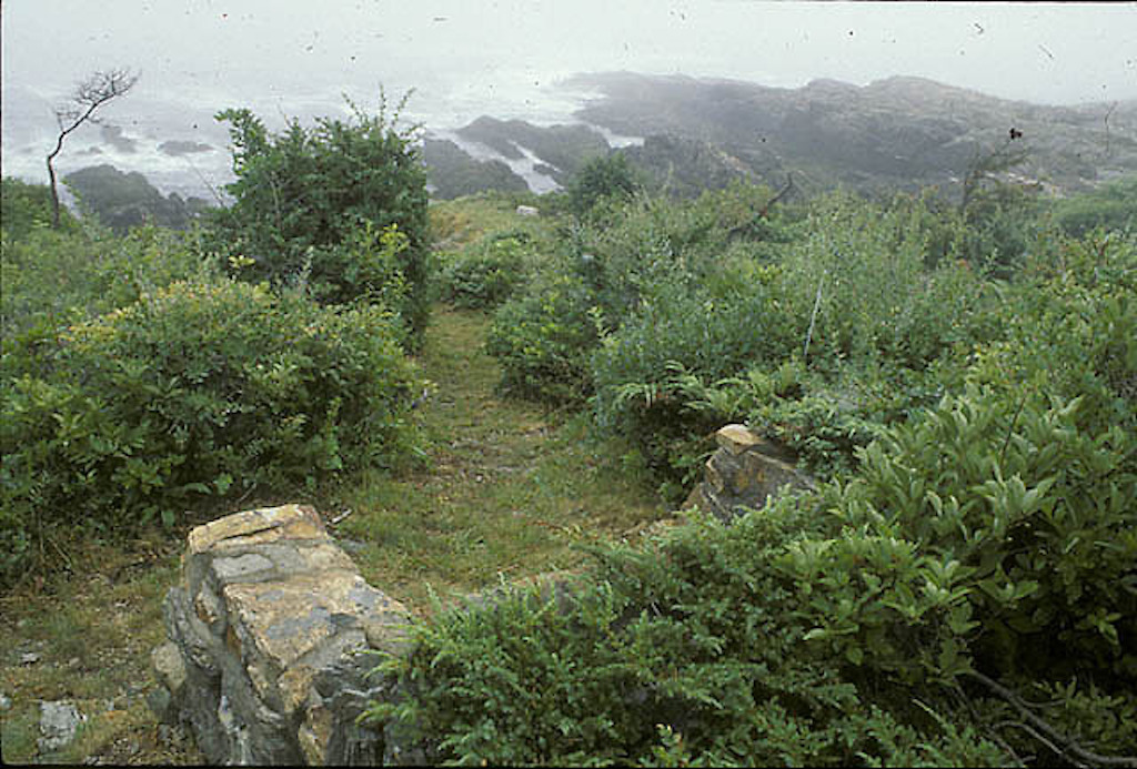 Color photo showing a stone bench on the bluff and distant view of the Atlantic Ocean from James Earle's property. Courtesy of Smithsonian Institution, Archives of American Gardens, The Garden Club of America collection. {Vista Water - Topography - Site Furnishing} [ME071004]