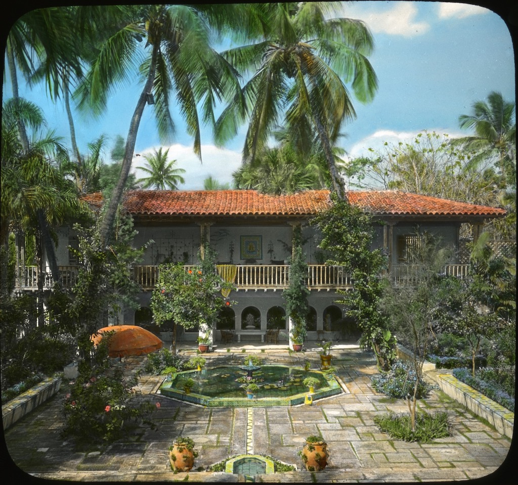 Hand-colored lantern slide of the Palm Beach Garden Club house and courttyard. Courtesy of Smithsonian Institution, Archives of American Gardens, The Garden Club of America collection. {Spatial Organization - Circulation - Site Furnishing - Building} [FL003002]
