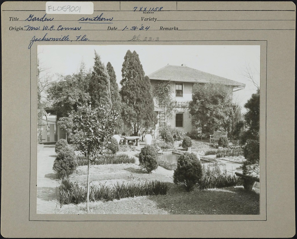 Black and white photograph showing the southern garden and house. Courtesy of Smithsonian Institution, Archives of American Gardens, J. Horace McFarland Company collection. {Spatial Organization - Topography - Circulation - Site Furnishing - Water Feature - Building} [FL059001]