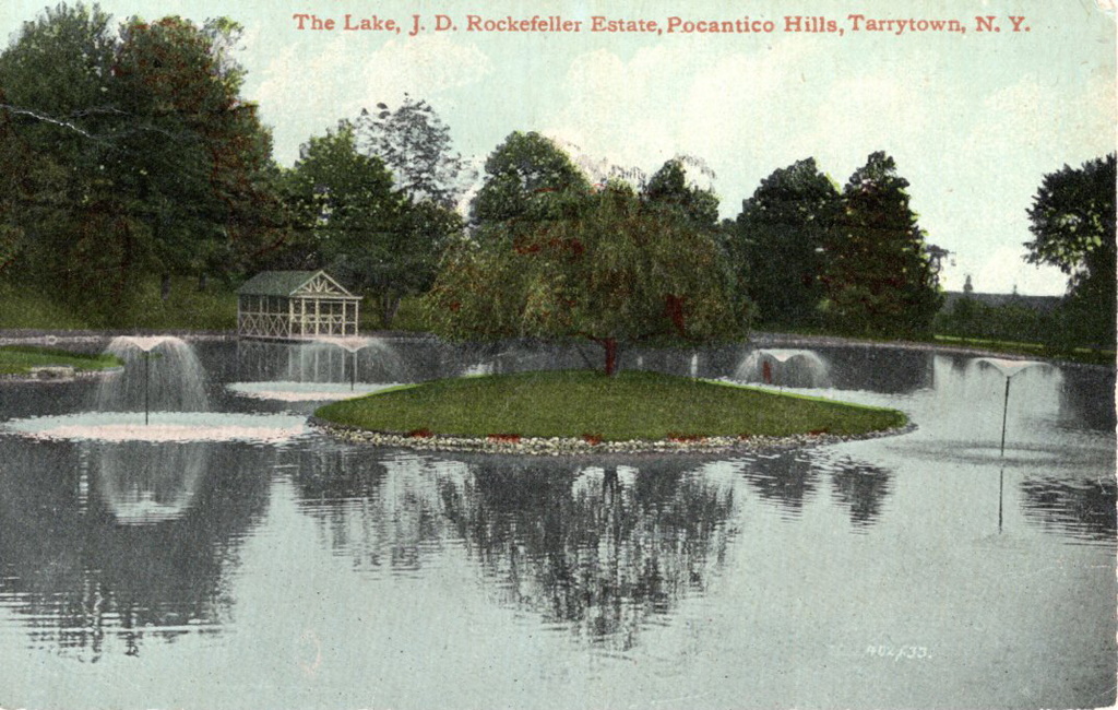 This postcard shows a view of a lake at the J.D. Rockefeller Estate in Tarrytown, NY.