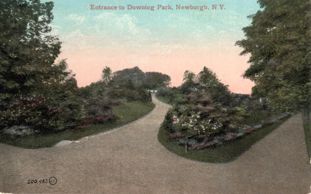 This postcard shows the entrance to Downing Park. {Vegetation - Circulation}