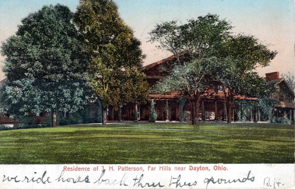 This postcard shows a view of J.H. Patterson's residence, "Far Hills". {Vegetation - Building}