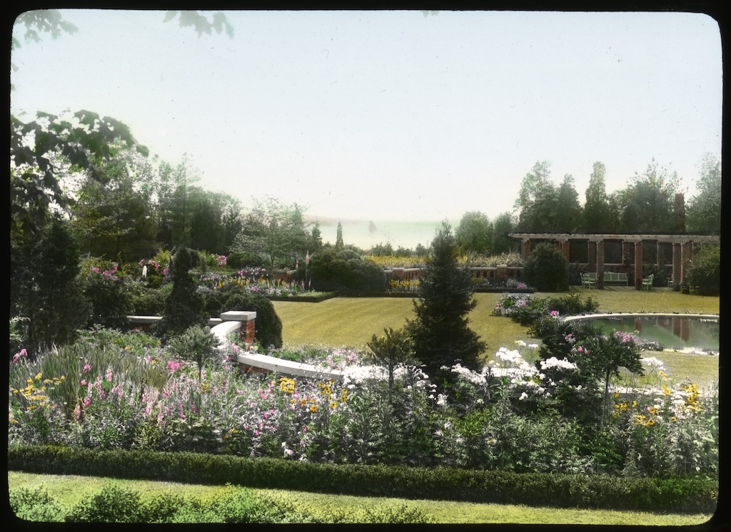 Hand-colored lantern slide photograph of the Welwyn gardens and distant view of Glen Cove. Courtesy of Smithsonian Institution, Archives of American Gardens, The Garden Club of America collection. {Spatial Organization - Vista-Water - Vegetation - Structure - Site Furnishing} [NY073004]