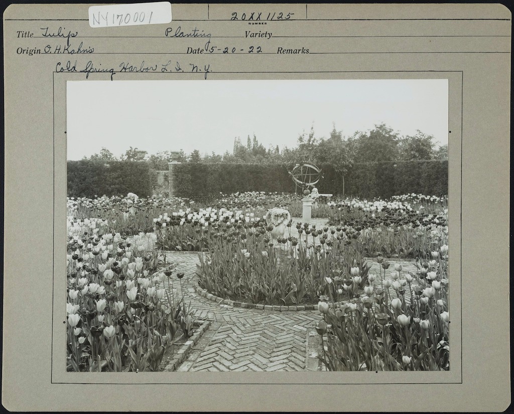 Black and white photographic print of Otto H. Kahns formal tulip garden and fountain. Courtesy of Smithsonian Institution, Archives of American Gardens, J. Horace McFarland Company collection. {Spatial Organization - Vegetation - Circulation - Structure - Site Furnishing} [NY170001]