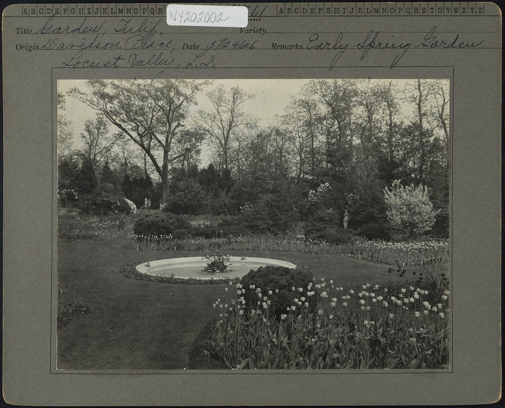 Black and white photographic print of spring tulips in the garden of H.P. Davison. Courtesy of Smithsonian Institution, Archives of American Gardens, J. Horace McFarland Company collection. {Vegetation - Water Feature} [NY202002]