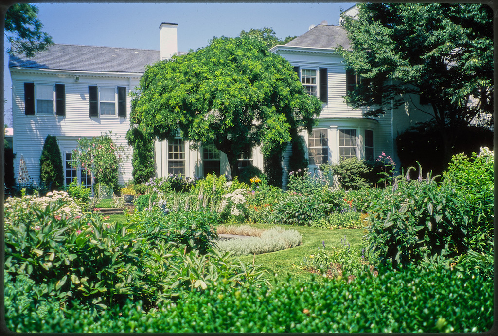 A color slide of Harvey D. Gibson's estate and formal garden. {Vegetation - Water Feature - Building} [NY1005003]
