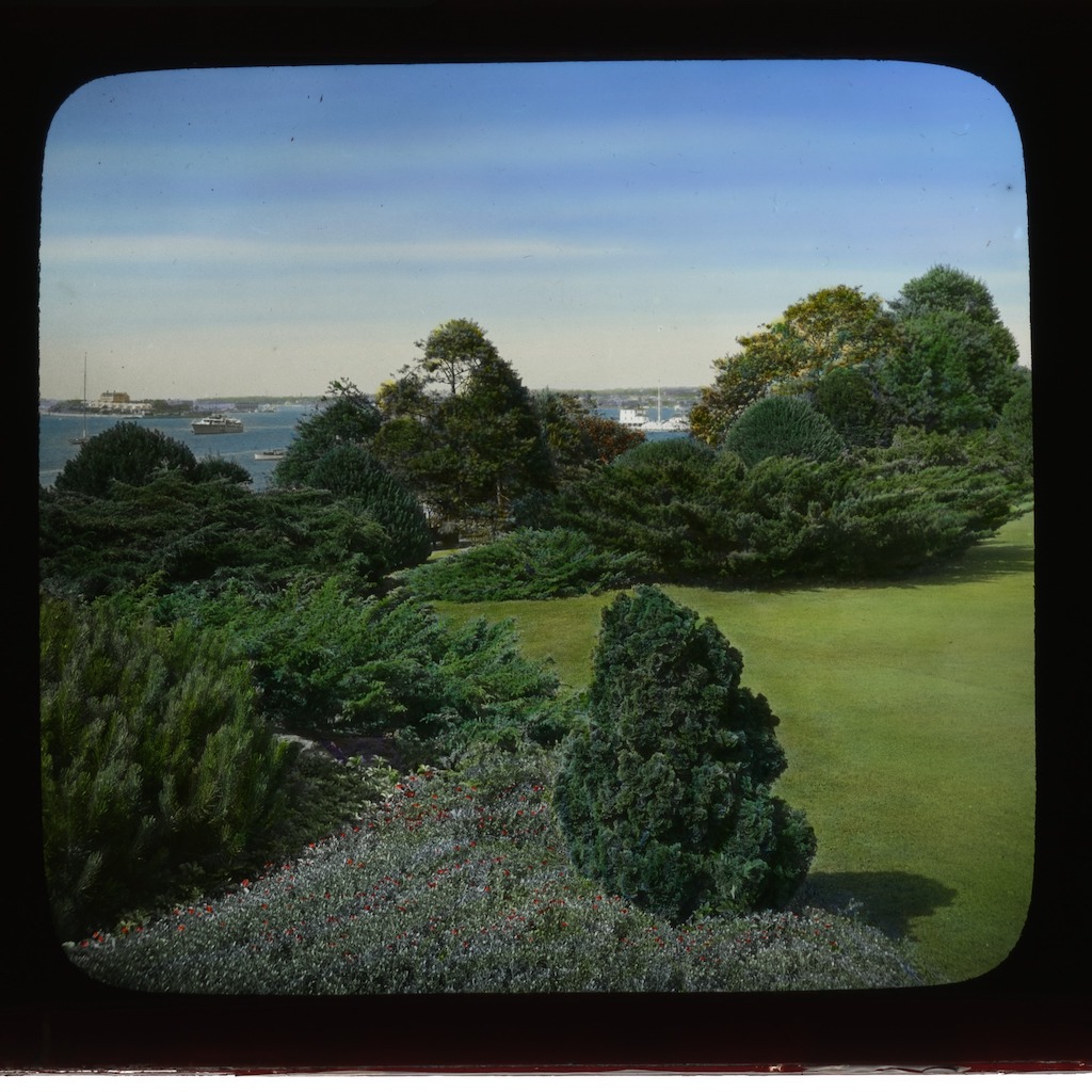 "Bonniecrest" - vista. Hand-colored lantern slide. Courtesy of Smithsonian Institution, Archives of American Gardens, The Garden Club of America collection. {Vista-Water - Vegetation} [RI031002]