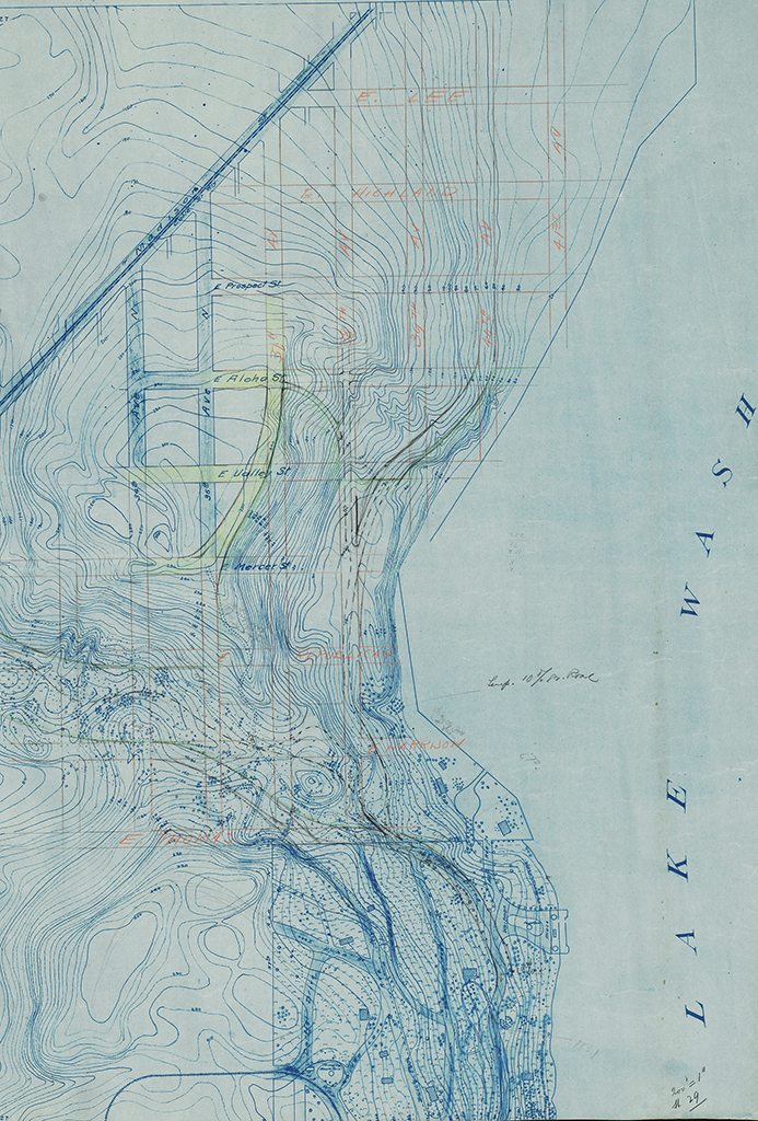 SEATTLE PARKS/ TOPO OF CITY WITH NOTES ON GROUND BY J.C.O. AND JONES/ SHOWING LAKE WASHINGTON