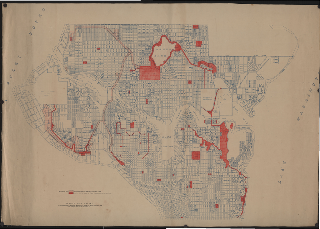 Seattle Park System / Proposed by Mr. J.C. Olmsted - January 1908 / Existing - Seattle Board of Park Commissioners Report 1922 / November 1928