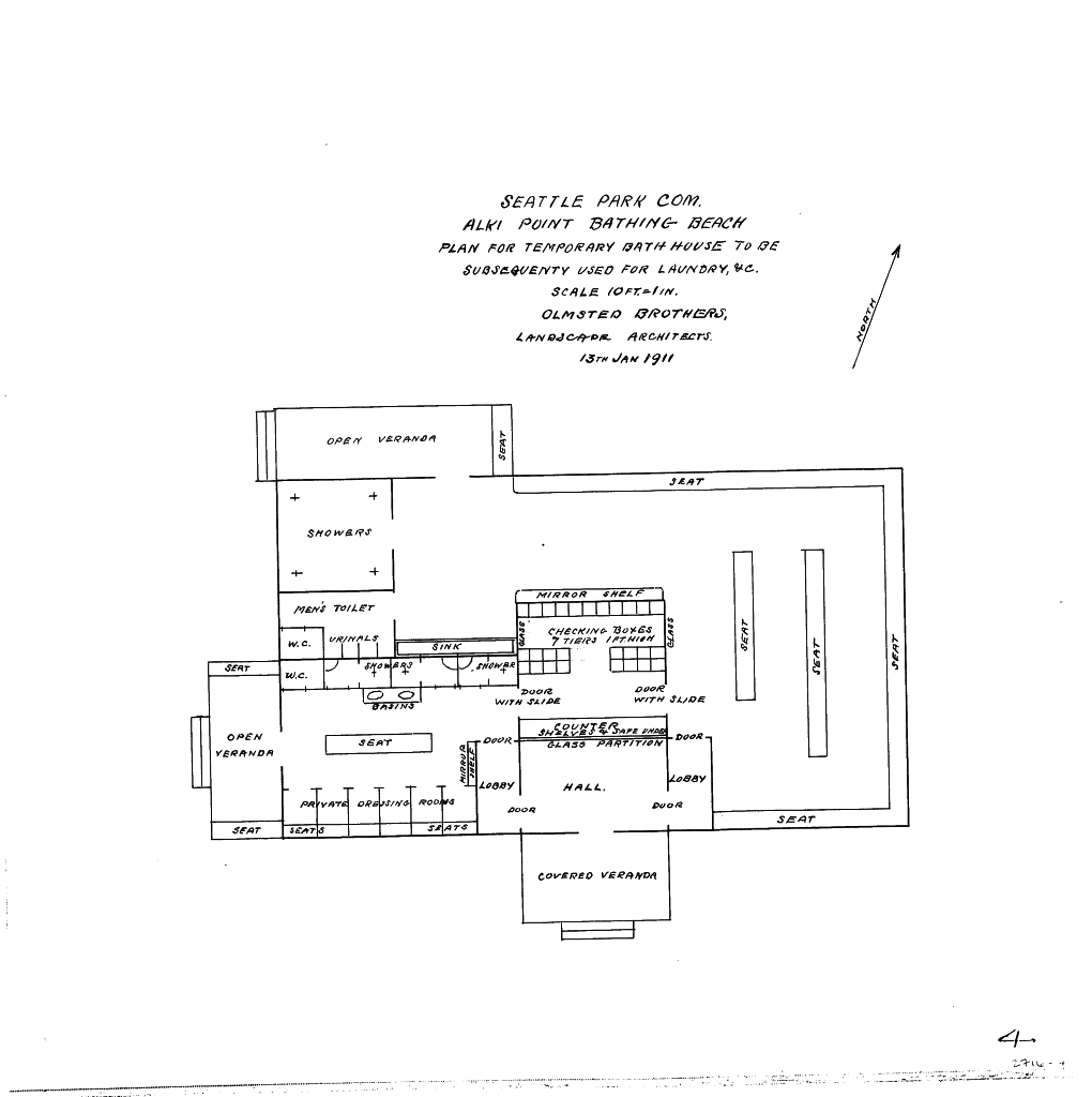 Seattle Park Commission / Alki Point Bathing Beach / Plan for temporary bath house to be / Subsequently used for laundry, etc. /