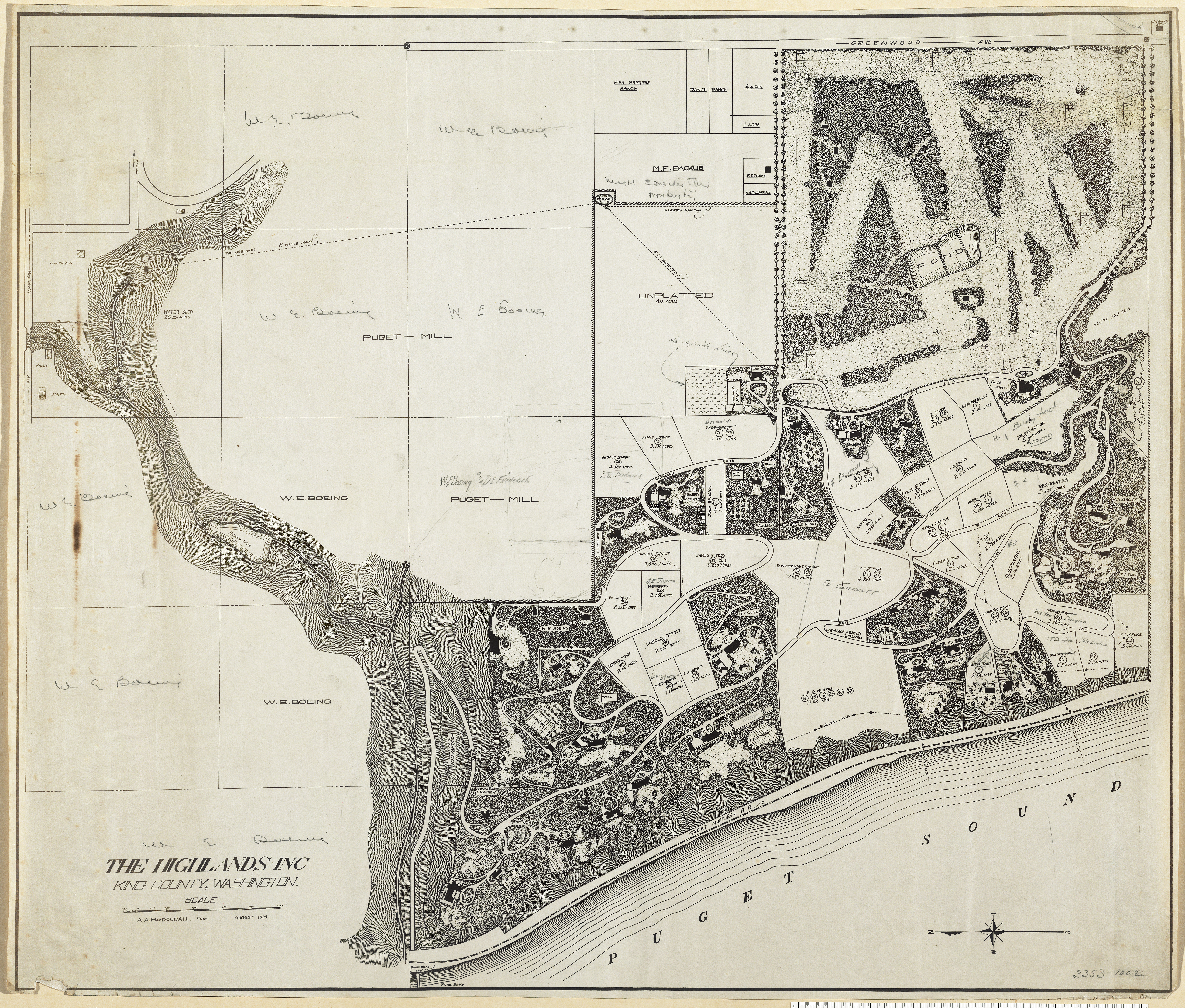 A. A. MacDonald Engr. orig./ Owners & Size of Houses, Lots P/I/ ( Indicates lots, roads, and Puget Sound.)/ These prints were numbered up by and rec'd from OBO. Calif. about 1940. P/I/
