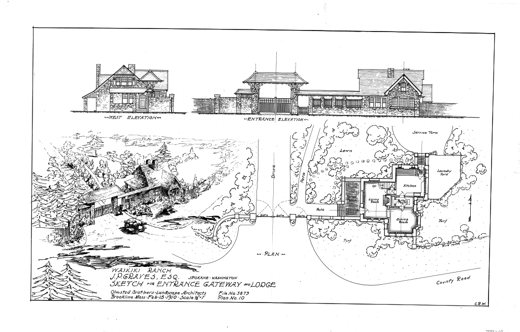 Waikiki Ranch/ J.P. Graves, Esq./ Spokane, Washington/ Sketch for Entrance Gateway and Lodge [r]/