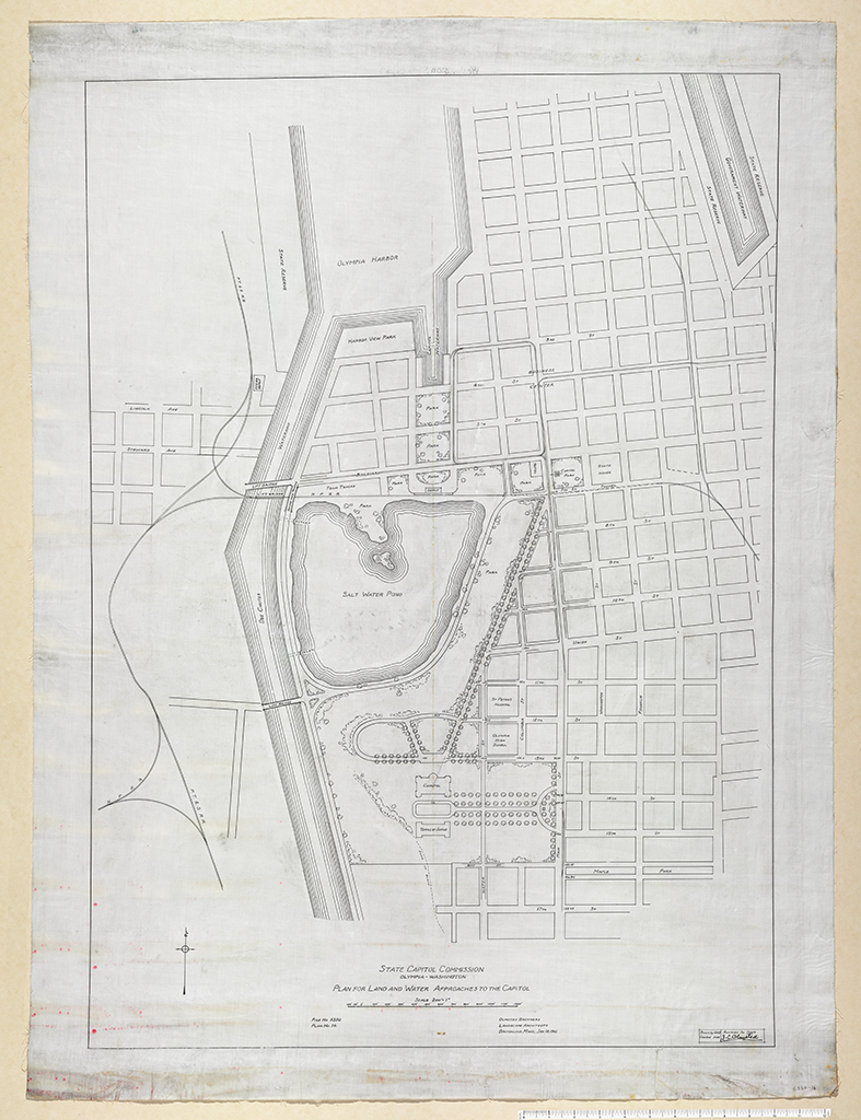 STATE CAPITOL COMMISSION, [STATE CAPITOL GROUNDS], OLYMPIA, WA - PLAN FOR LAND & WATER APPROACHES TO THE CAPITOL; PRELIMINARY PLAN FOR SECTION OF CITY ADJOINING CAPITOL GROUNDS [PI]