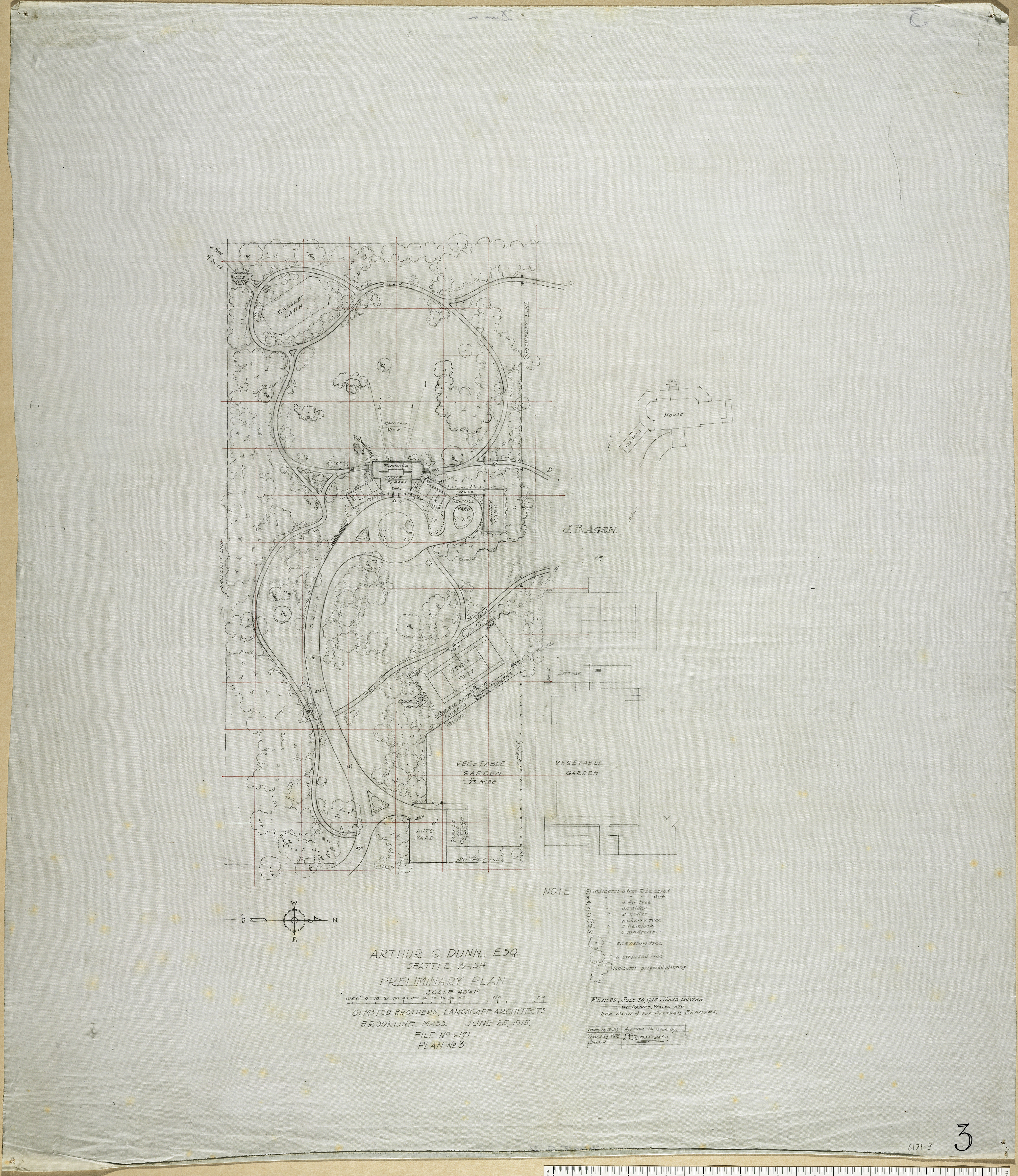 NOTE(S): [INCLUDES SIGHT LINES & KEY TO TREES]; SEE PLAN #4 FOR FURTHER CHANGES. PROVENANCE: OB/LA; [DR. BY?] H. H. B.; APPROVED FOR ISSUE BY J. F. DAWSON; AND "BLOSSOM" [PI]. DATE INFO: 25-JUN-1915; (REVISED) 30-JUL-1915.