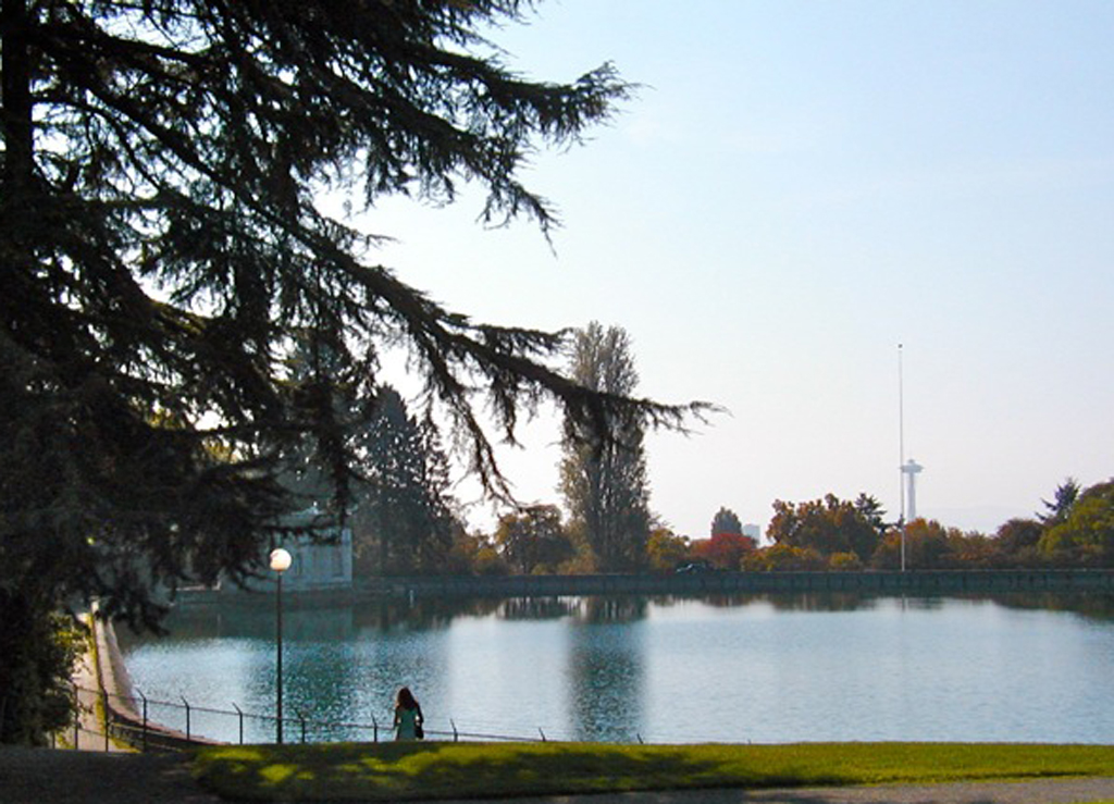 Autumn view across historic Volunteer Park Reservoir. {Vista - Water Feature - Structure}