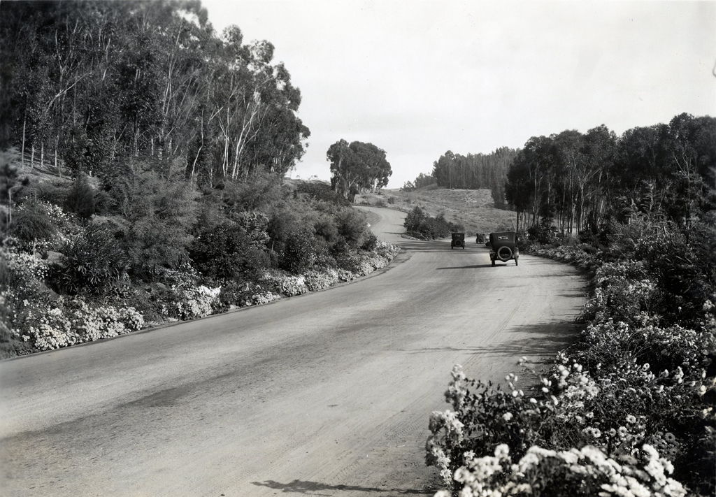 Main Entrance road into Palos Verdes Estates through the Eucalyptus Grove. {Topography - Vegetation - Circulation} [photo album 05950-13-ph007a]