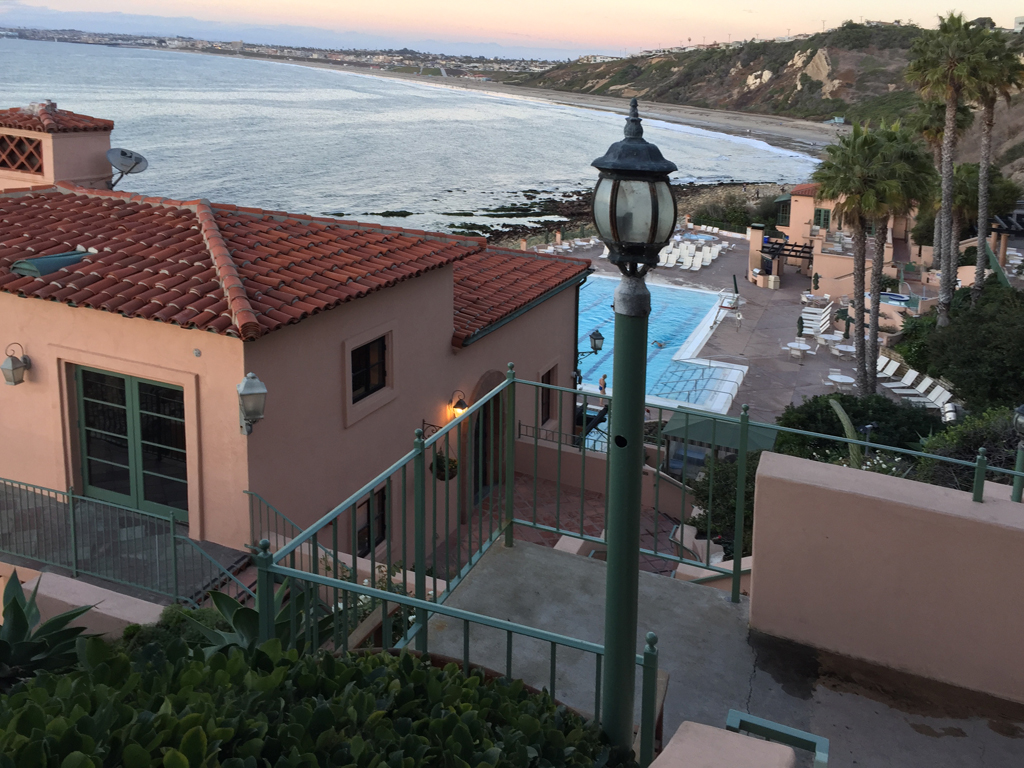 VIsta down stairs to Palos Verdes Beach Club. {Topography - Vista - Site Furnishing - Building}
