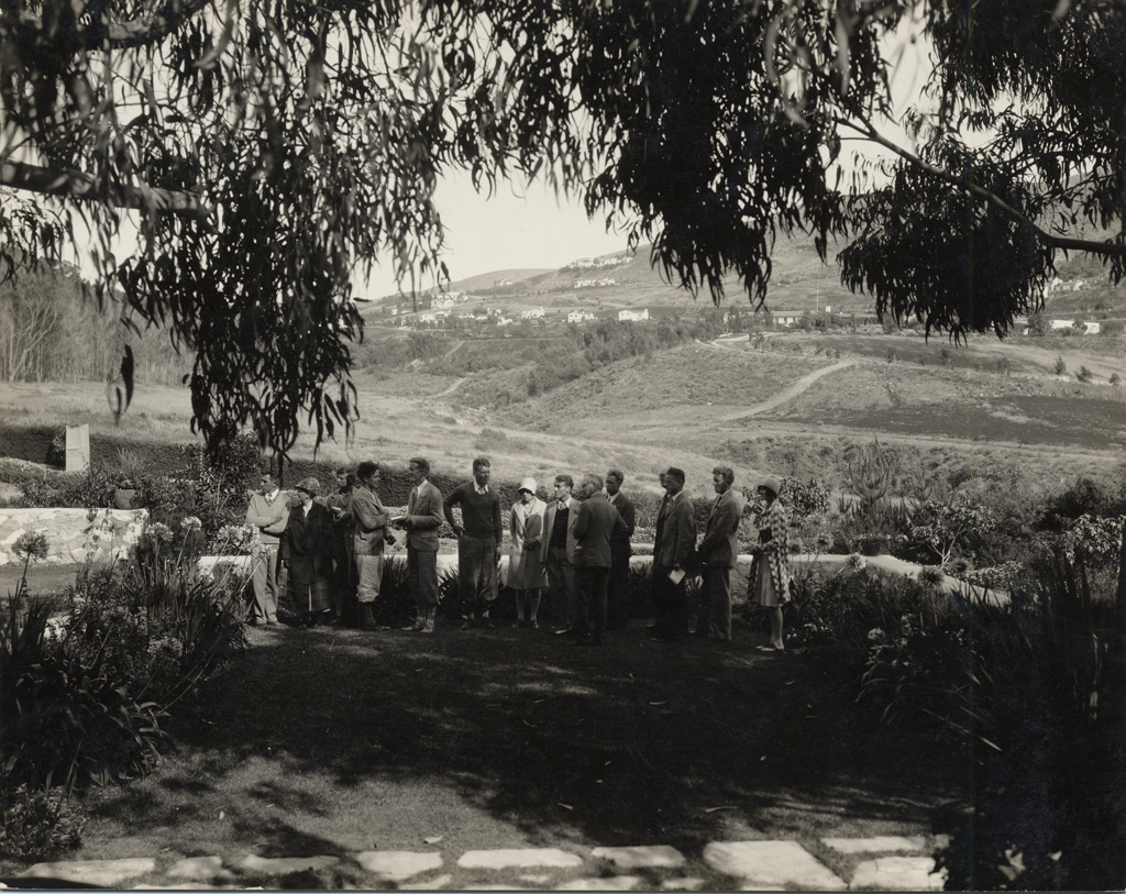 Looking south from garden terrace with Mr. Olmsted sixth from right. Courtesy of Palos Verdes Homes Association Photograph Collection. {Vista - Topography - Vegetation} [PVLD:3822 (000016121)]