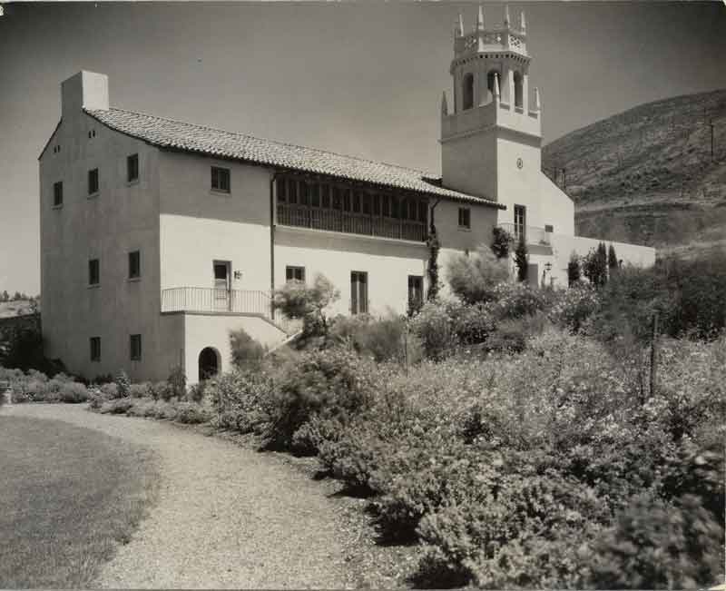 View of Malaga Cove School looking southeast, with lush, terraced planting. Courtesy of Palos Verdes Homes Association Photograph Collection. {Vegetation - Circulation - Building} [PVLD:3885 (000029264)]
