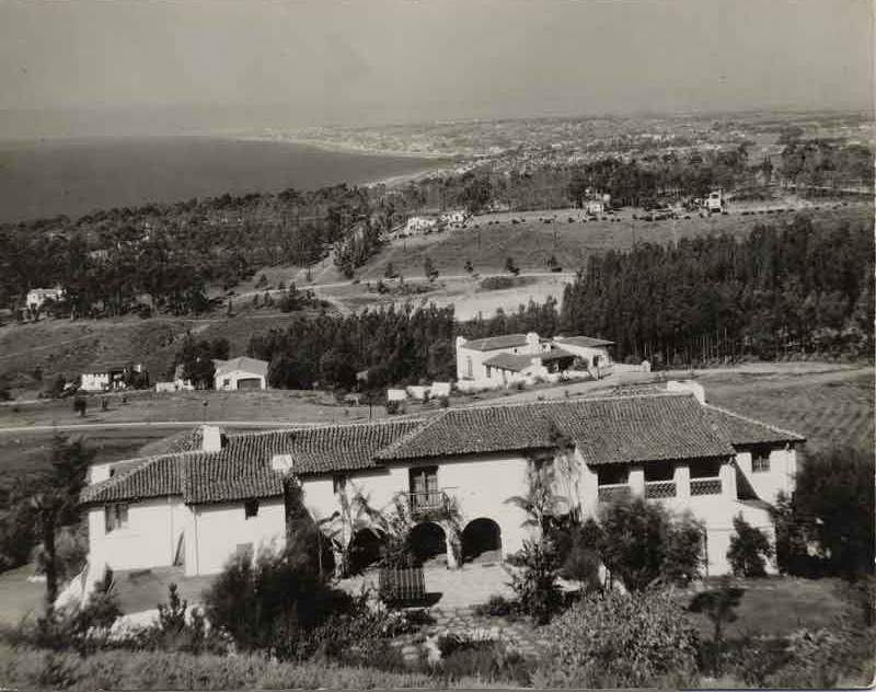 Gard residence viewed from Sutherland site (job 08096) on hillside above. Courtesy of Palos Verdes Homes Association Photograph Collection. {Topography - Vegetation - Building} [PVLD:3717 (000023911)]