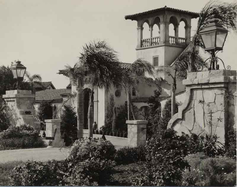 Entrance to the Italianate villa built as a summer residence for John Joseph Haggarty and his wife Bertha Schneider. Courtesy of Palos Verdes Homes Association Photograph Collection. {Vegetation - Circulation - Structure - Building} [PVLD:3493 (000015776)]