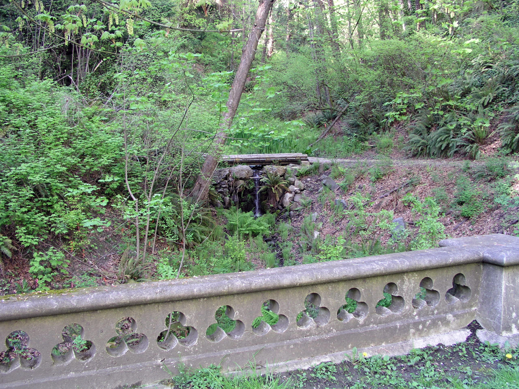 Lake Washington Boulevard crosses the creek in Frink Park on a decorative concrete bridge with a view of a waterfall beyond. {Circulation - Water Feature - Structure}