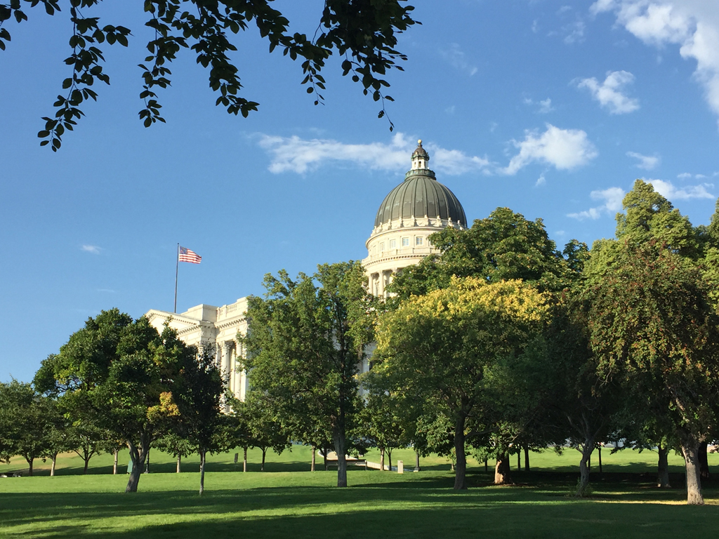 View from southwest across Utah State Capitol grounds. (Vegetation - Building)