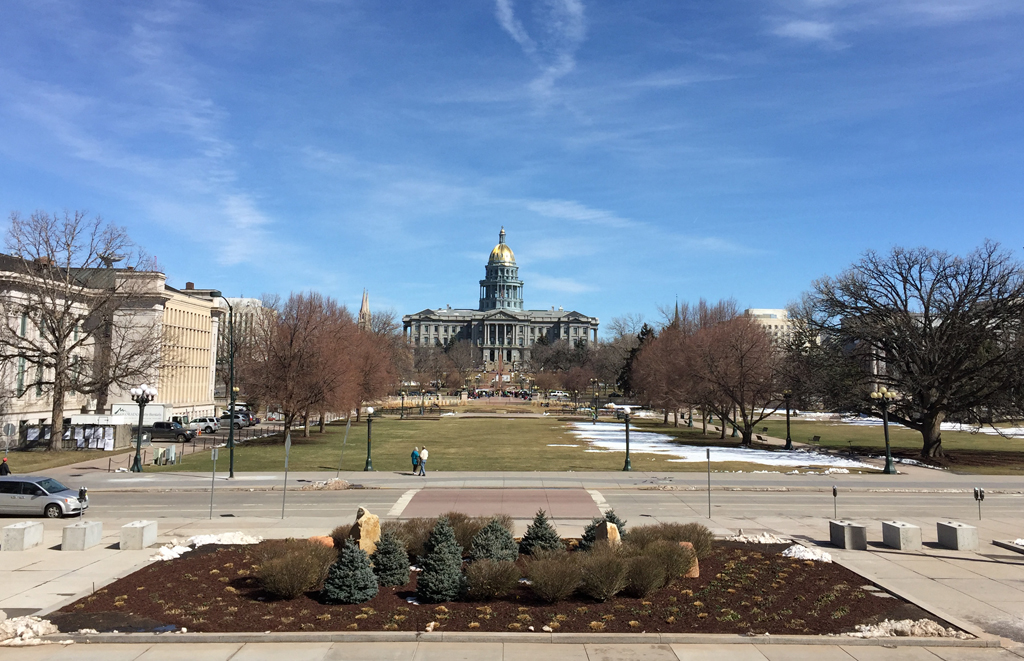 View of Colorado State Capitol across mall. (Vegetation - Circulation - Site Furnishing - Building)