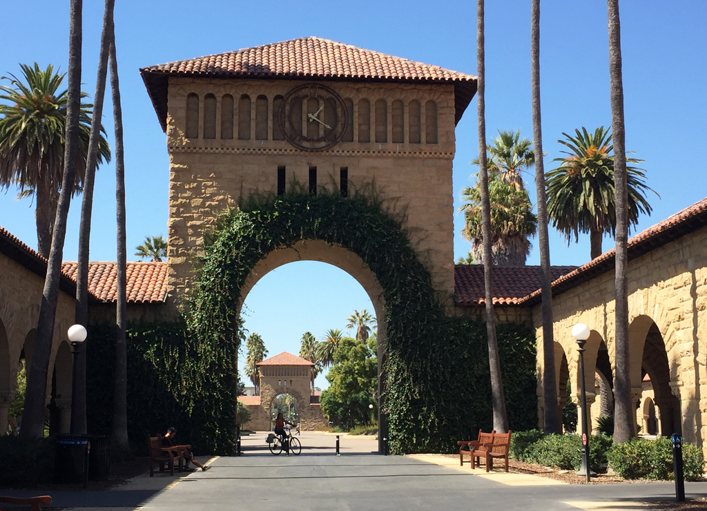 View of arches framing the east and west entrances to the Main Quad of Stanford University. {Vegetation - Circulation - Building}