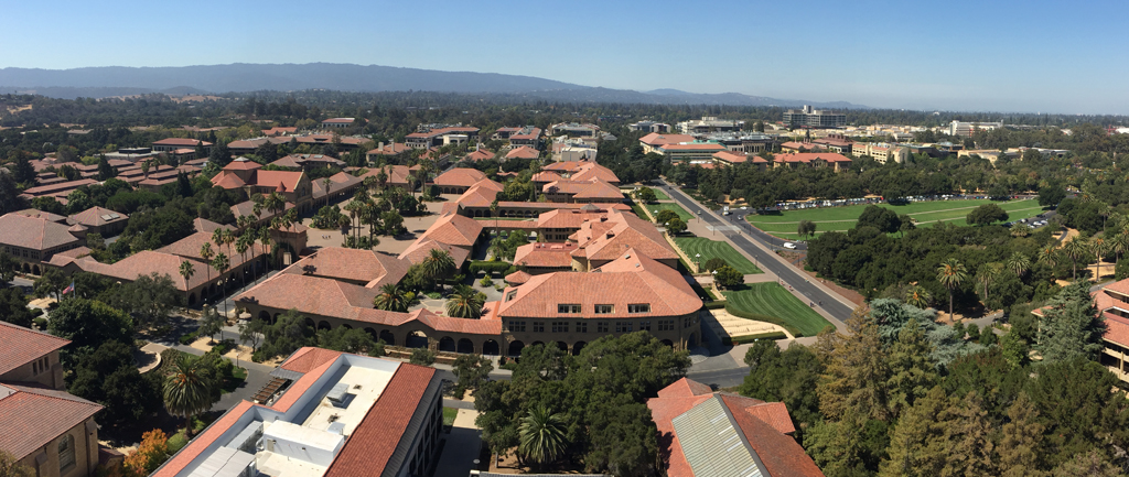 View from the Hoover Tower looking west with the Main Quad on the left and the Stanford Oval on the right. {Spatial Organization - Topography - Vegetation - Circulation - Building}