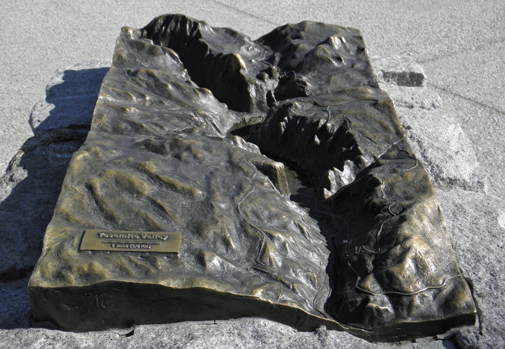 F.L. Olmsted described the main feature Yosemite Valley as a chasm on average a mile wide and ten miles long with walls rising a half mile to, in some cases, nearly a mile high. This bronze model at Artist Point of Yosemite Valley helps the visitor to comprehend the extent of the valley that lies below them. {Spatial Organization - Topography - Circulation - Site Furnishing}