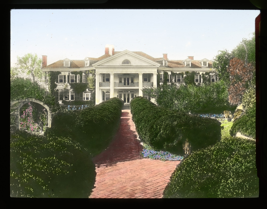 Hand-colored lantern slide showing the entryway to Boxly house, mature boxwood, and surrounding gardens. Courtesy of Smithsonian Institution, Archives of American Gardens, The Garden Club of America collection. {Vegetation - Circulation - Building} [PA009003]
