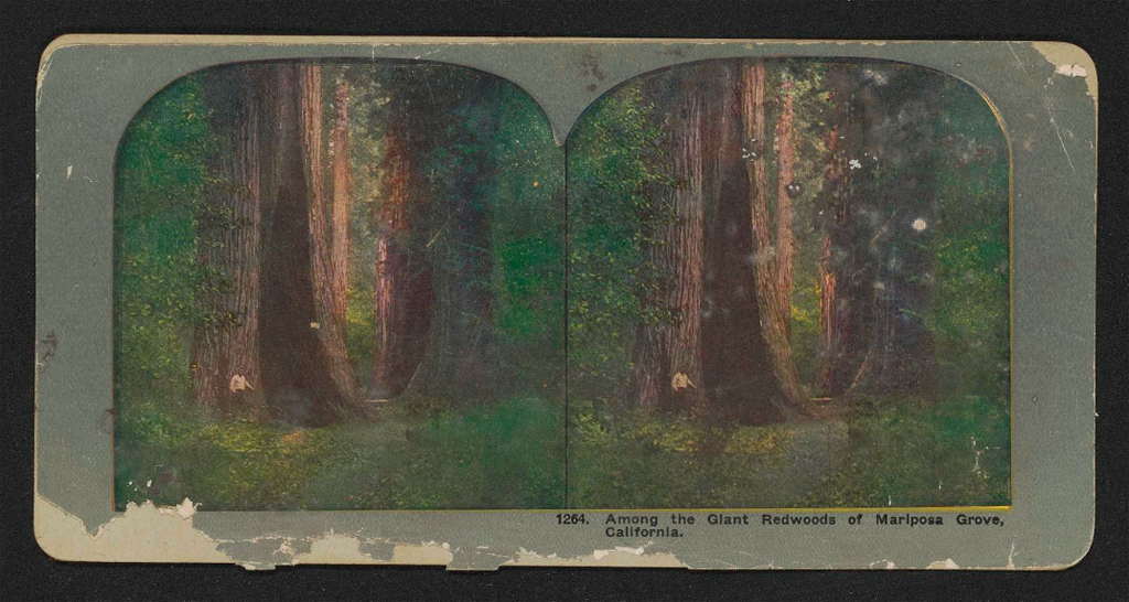 Color stereograph shows Mariposa Grove, which FL Olmsted and JC Olmsted visited in 1864 when FL Olmsted was managing the Mariposa Estate gold mines. The trees in Yosemite National Park are Giant Sequioas, as Redwoods grow near the coast rather than inland, but the name Giant Redwoods was often used interchangeably at the time this stereograph was made between 1914-1949. Courtesy of Smithsonian Institution, Archives of American Gardens, Historic Gardens Stereograph collection. {Vegetation} [STR002024_001]