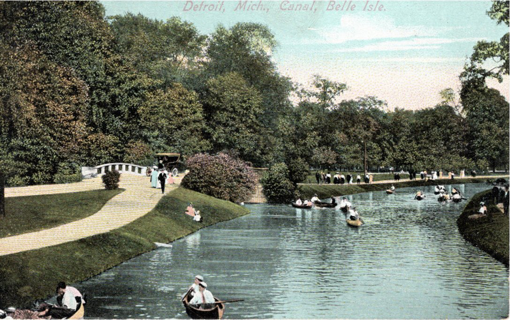 In his plan for Belle Isle of 1883, Frederick Law Olmsted designed the semi-circular canal at the eastern end of the island as a protected area for canoes and small boats. He used it to separate the section of the park containing the steamboat pier and sports facilities from the more extensive area of meadows and open woods. - C.E. Beveridge {Vegetation - Circuation - Water Feature - Structure}