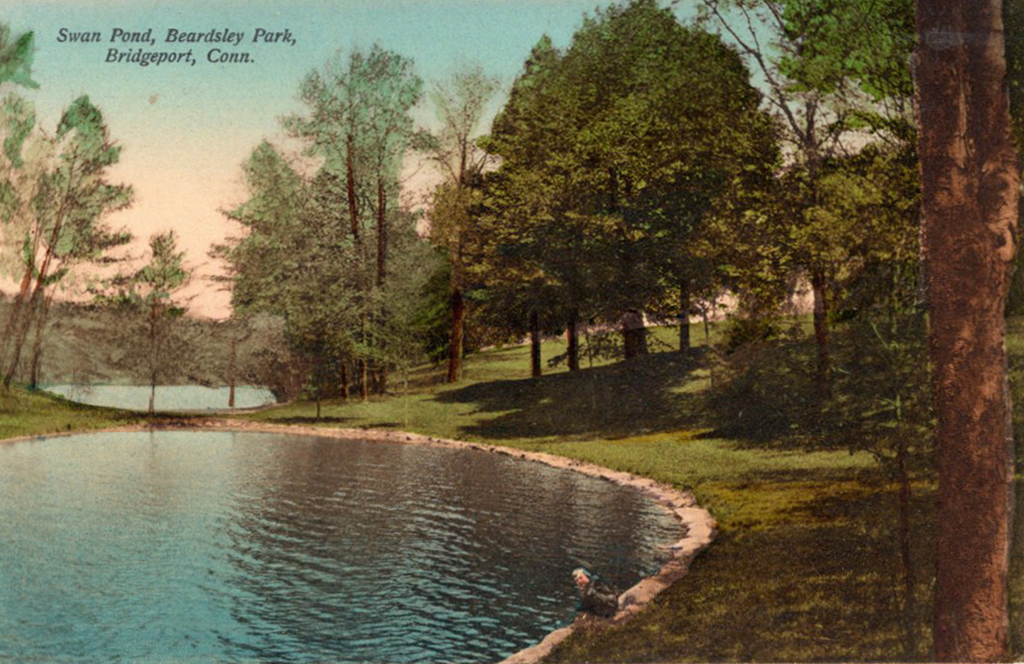 A depiction of Swan Pond in Beardsley Park designed by Frederick Law Olmsted in 1884. {Vegetation - Circulation - Water Feature}