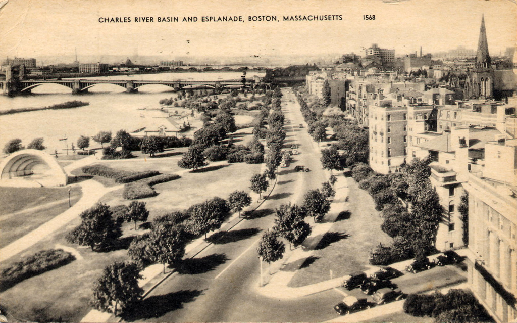 Aeriel view of Storrow Drive along the Charles River and Longfellow Bridge. {Vegetation - Circulation)