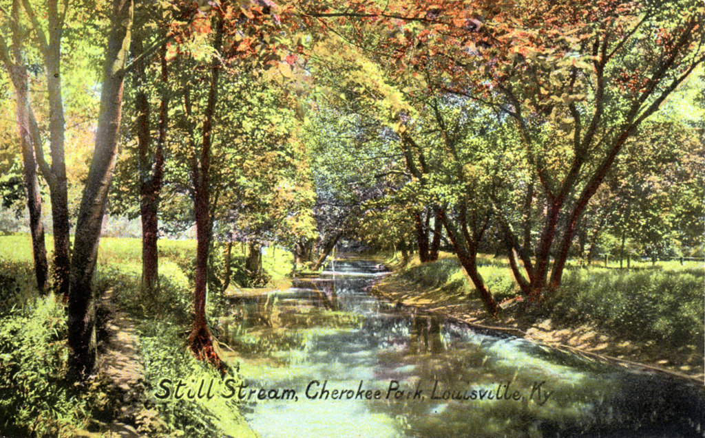 Bear Grass Creek flows through Cherokee Park, designed by Olmsted beginning in 1891. Open groves of trees on either side of the stream made possible Olmsted’s intent that visitors enjoy “the contemplation of superb umbrageous trees, standing singly and in open groups, distributed naturally upon a gracefully undulating greensward.” - C.E. Beveridge {Vegetation - CIrcuation - Water Feature - Structure}