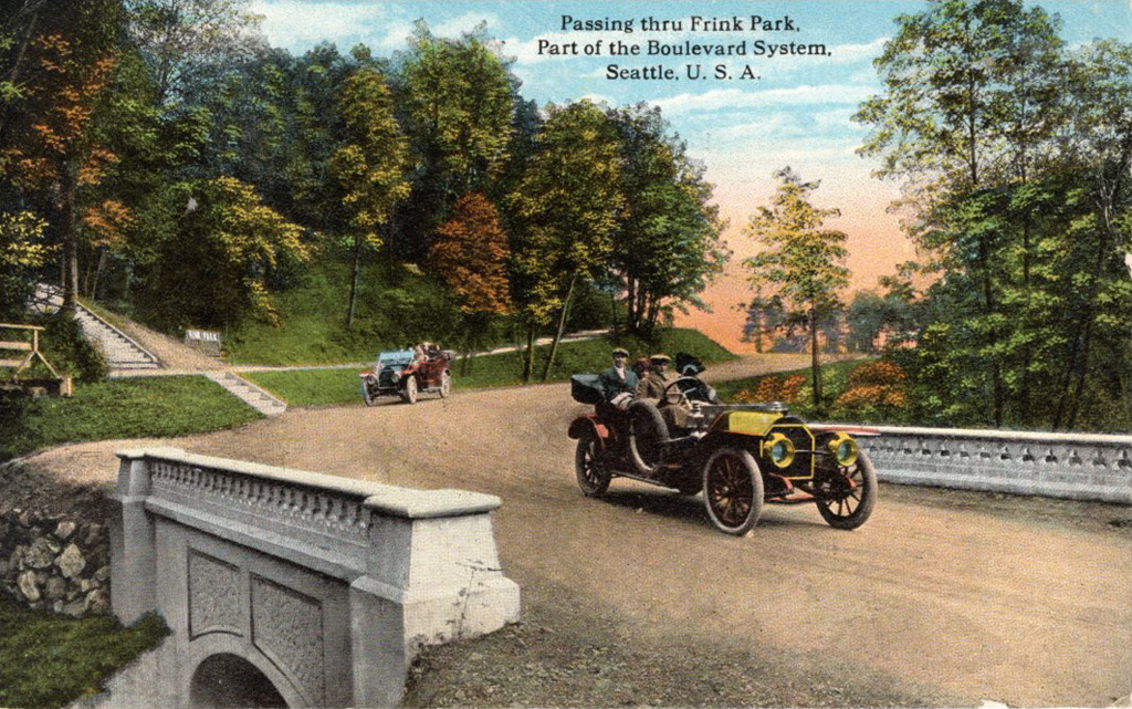 The Olmsted Brothers wrote in 1903 that “…comparatively …few cities have what can properly be called a comprehensive, well-balanced and well-developed system of parks… A connected system of parks and parkways is manifestly far more complete and useful than a series of isolated parks…” The drive through Frink Park, designed by John C. Olmsted in 1907, is a picturesque element of the 20-mile Olmsted system of boulevards and parkways connecting the numerous parks that make up Seattle’s historic park system. - C.E. Beveridge {Vegetation - CIrcuation - Structure}