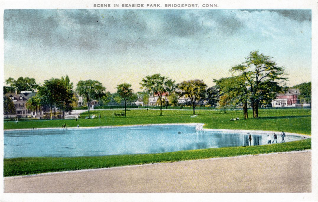 Olmsted and Vaux prepared plans for Seaside Park around 1867. The postcard depicts the edge green alonng the shore. {Vegetation - Circulation - Water Feature}