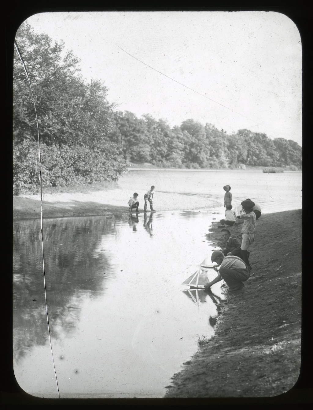 Black and white lantern slide of children playing at Jamaica Pond. Courtesy of Smithsonian Institution, Archives of American Gardens, Historic Gardens Stereograph collection. {Topography - Water Feature} [MA050001]