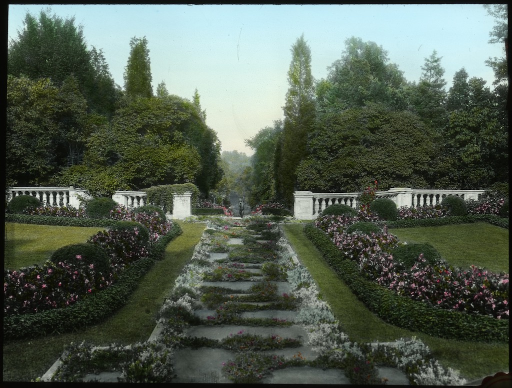 Hand-colored lantern slide photo of path, ballistrudes, and rosebuds. Courtesy of Smithsonian Institution, Archives of American Gardens, The Garden Club of America collection. {Vista - Topography - Circulation} [CT018004]