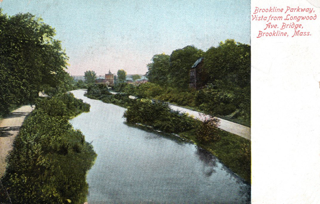 This postcard is labeled as showing Brookline Parkway viewed from Longwood Bridge. {Vegetation - Circulation-Boulevard - Water Feature}